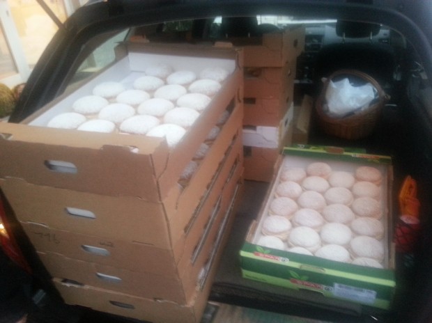 Mehr als 2500 schöne, frische Krapfen wurden von der Bäckerei Bag in Bregenz produziert und von treuen Helfern am Montag und Dienstag Morgen im ganzen Land zugestellt.